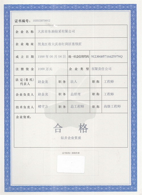 大慶東油鉆井企業(yè)資質(zhì)證書